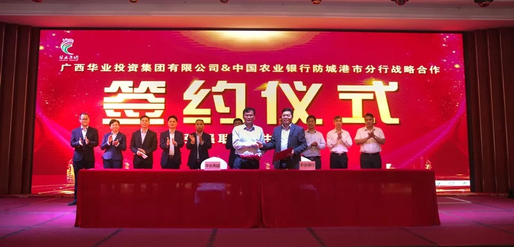 2018年3月28日,廣西華業(yè)投資集團(tuán)有限公司與中國農(nóng)業(yè)銀行防城港分行在廣西防城港華業(yè)城舉行戰(zhàn)略合作簽約儀式。華業(yè)集團(tuán)董事長龍其生、龍其偉總裁、副總裁廖人興、副總裁龐樹玉、副總裁熊昭斐、財務(wù)總監(jiān)李情,中國農(nóng)業(yè)銀行防城港分行行長顏雄、副行長陳增熙、公司部總經(jīng)理唐健文、農(nóng)業(yè)銀行防城支行行長劉威、副行長易成等領(lǐng)導(dǎo)和嘉賓出席了簽約儀式。廣西華業(yè)集團(tuán)副總裁廖人興和中國農(nóng)業(yè)銀行防城港分行副行長陳增熙代表雙方簽署了授信60億元人民幣的戰(zhàn)略合作協(xié)議。