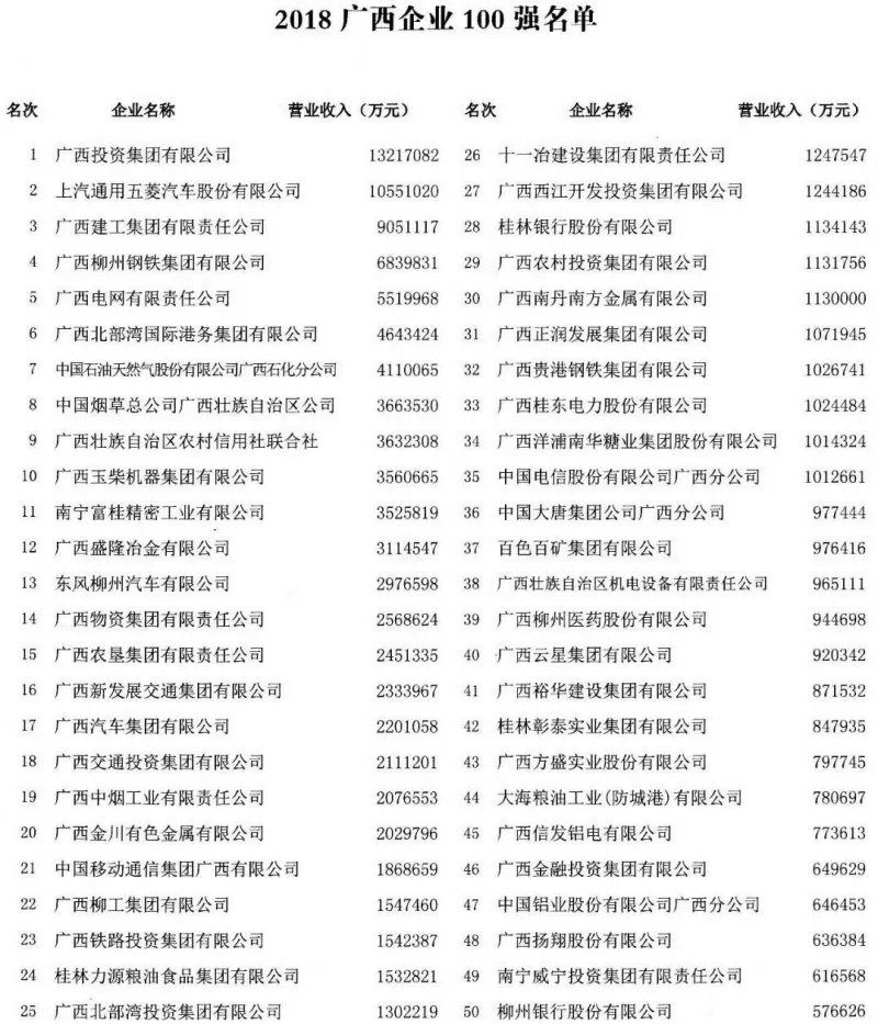 大會(huì)揭曉了2018年廣西企業(yè)100強(qiáng),以及廣西民營(yíng)企業(yè)50強(qiáng)榜單。廣西投資集團(tuán)有限公司、上汽通用五菱汽車股份有限公司、廣西建工集團(tuán)有限公司位列廣西企業(yè)100強(qiáng)榜單前三甲。廣西華業(yè)集團(tuán)旗下子公司廣西華業(yè)建筑工程有限公司以營(yíng)業(yè)收入41.9億元,位列廣西百?gòu)?qiáng)企業(yè)第57名,并躋身廣西民營(yíng)企業(yè)50強(qiáng)第15強(qiáng)。