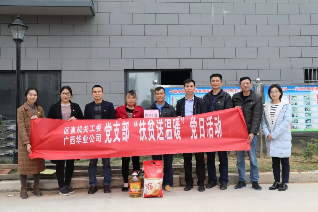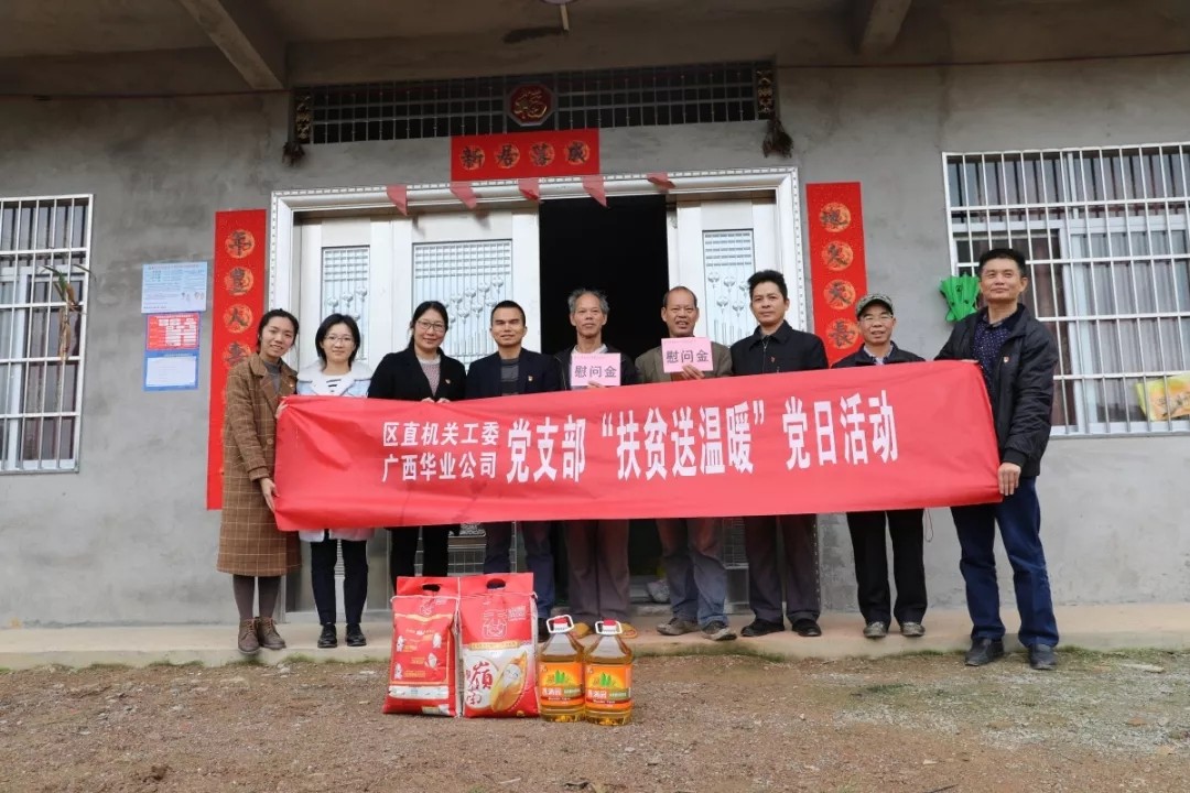 為充分發(fā)揮黨建引領(lǐng)作用,扎實(shí)有效推進(jìn)精準(zhǔn)脫貧工作,2019年1月15日防城區(qū)直機(jī)關(guān)工委黨支部和廣西華業(yè)投資集團(tuán)有限公司黨支部聯(lián)合深入防城區(qū)那良鎮(zhèn)開展了以 “扶貧送溫暖”為主題的黨日活動(dòng)。防城區(qū)直機(jī)關(guān)工委書記許紹銳、副書記蘇良東、紀(jì)工委書記宋明雄,華業(yè)集團(tuán)副總裁熊昭斐、工會(huì)主席鐘麗霞帶領(lǐng)兩支部多名黨員一起參加了扶貧慰問活動(dòng)。