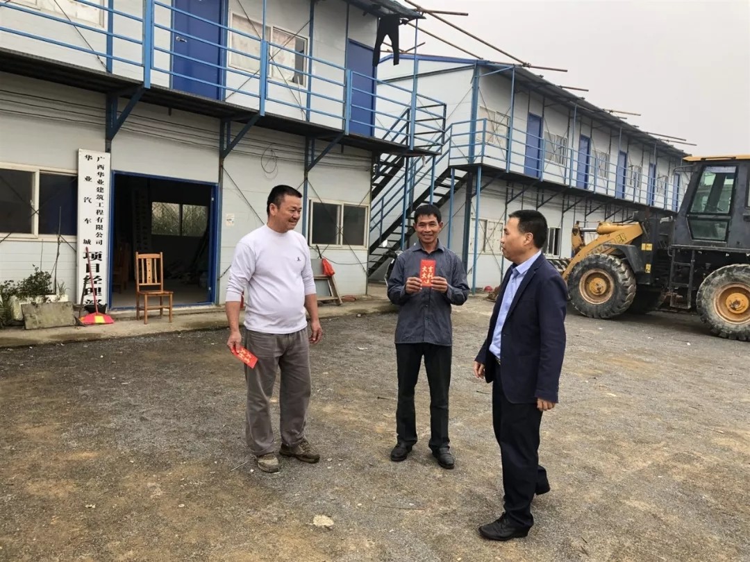 在慰問(wèn)項(xiàng)目部的時(shí)候,龍其偉總裁代表集團(tuán)公司衷心感謝項(xiàng)目部留守人員為保護(hù)公司財(cái)產(chǎn)、為加快項(xiàng)目施工進(jìn)度而放棄休假、舍小家為大家、繼續(xù)加班加點(diǎn)工作的施工管理人員、民工及其家屬們表達(dá)了崇高的敬意,并致以最美好的新春?jiǎn)柡蚝妥8#⒎愿佬姓肮こ滩块T(mén)對(duì)留守員工們?cè)诖汗?jié)期間的生活給予了細(xì)致周到的安排保障,務(wù)必讓大家在項(xiàng)目部也一樣能夠過(guò)上一個(gè)歡樂(lè)祥和的新春佳節(jié)!