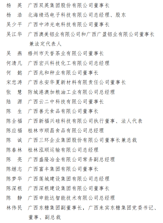 為進一步激勵廣大民營企業(yè)家堅定理想信念,不斷激發(fā)創(chuàng)業(yè)創(chuàng)新熱情,履行社會責(zé)任,助力鄉(xiāng)村振興,11月22日,自治區(qū)黨委統(tǒng)戰(zhàn)部、自治區(qū)工商聯(lián),廣西光彩事業(yè)促進會決定對黃東等2022年度98位優(yōu)秀民營企業(yè)家進行通報表揚。